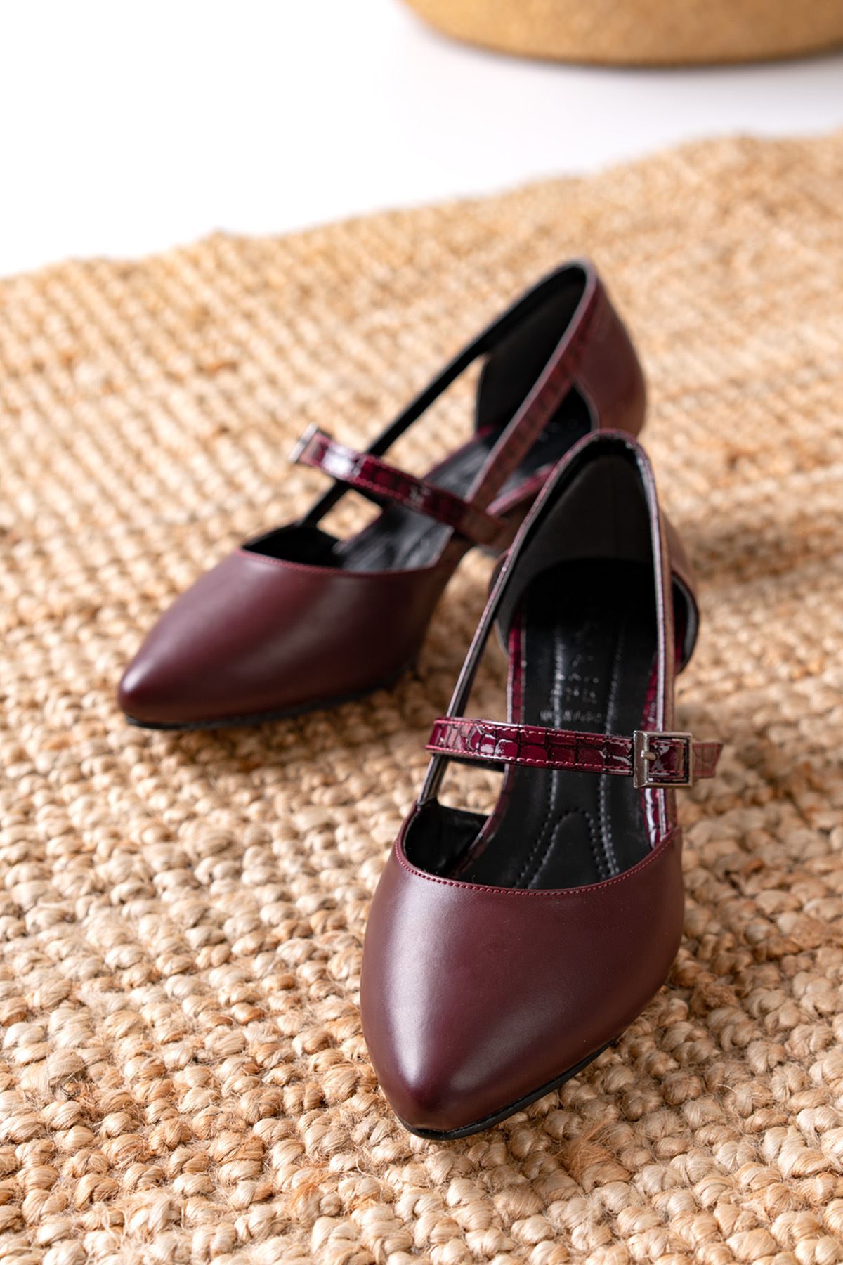 Renk: Bordo Detay:Topuklu Malzeme: Cilt Topuk Boyu: 3,5 cm. Taban Materyali: Neolit Jurdan Taban İç Taban: Pad'li İç Taban. Kalıp: Standart Ayak Ölçülerine Göre Dar Kalıp.