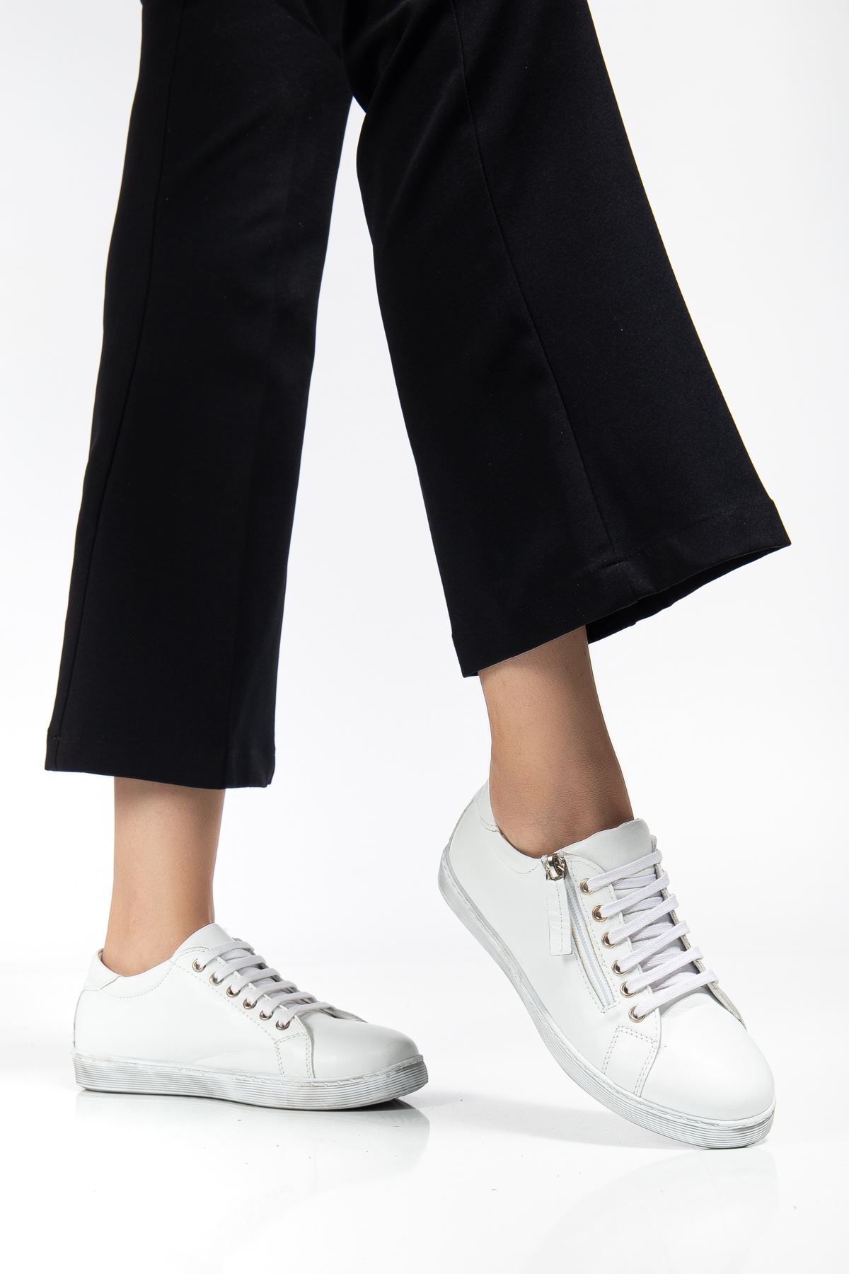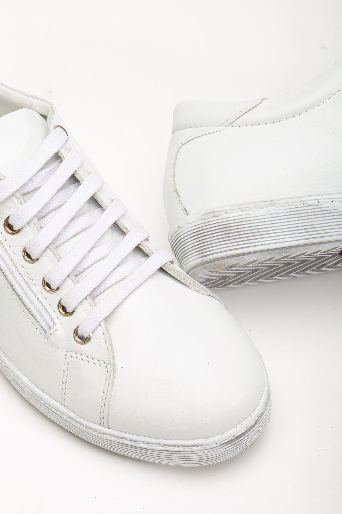 Kadın Beyaz Hakiki Deri Yandan Fermuarlı Bağcıklı Spor Ayakkabı