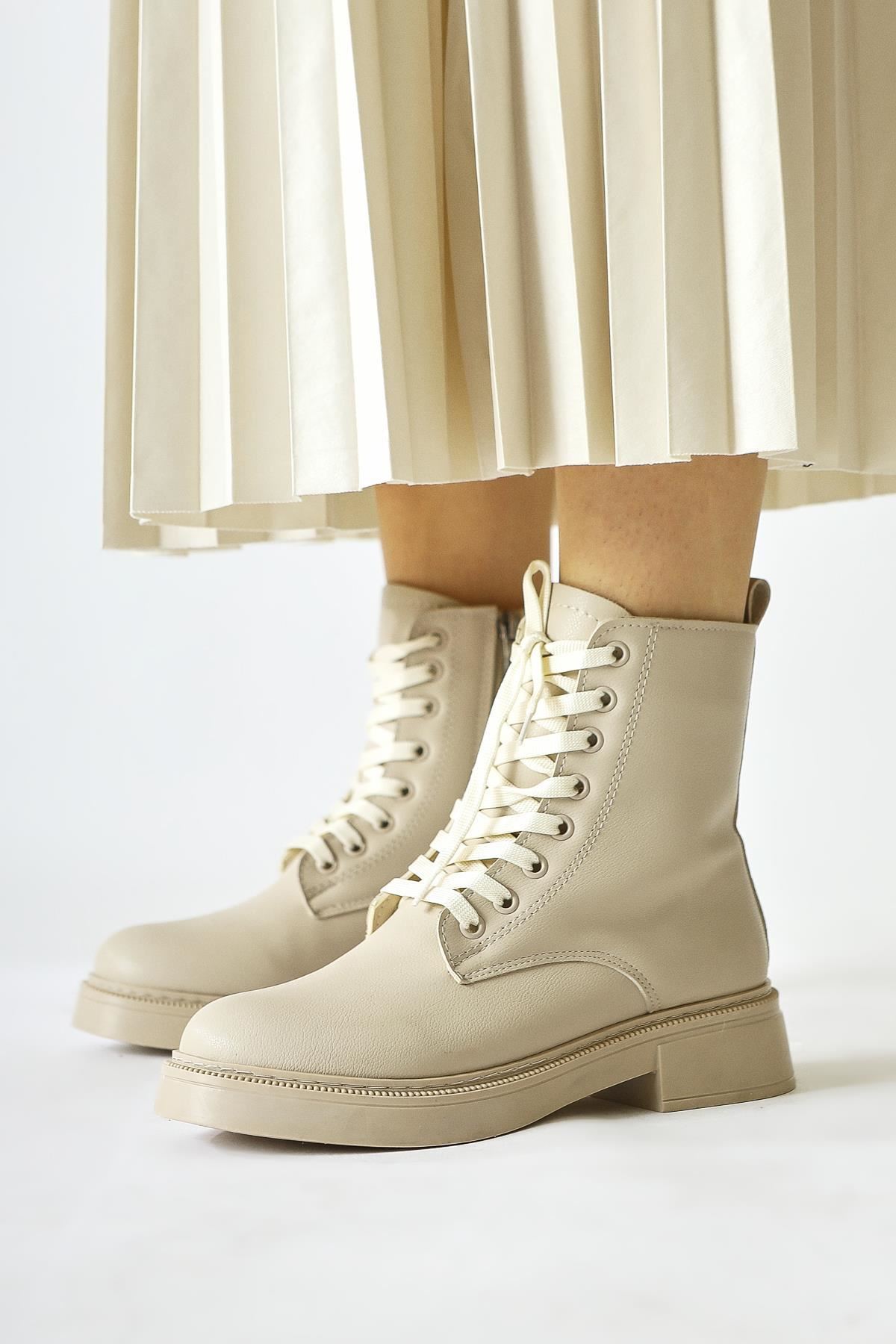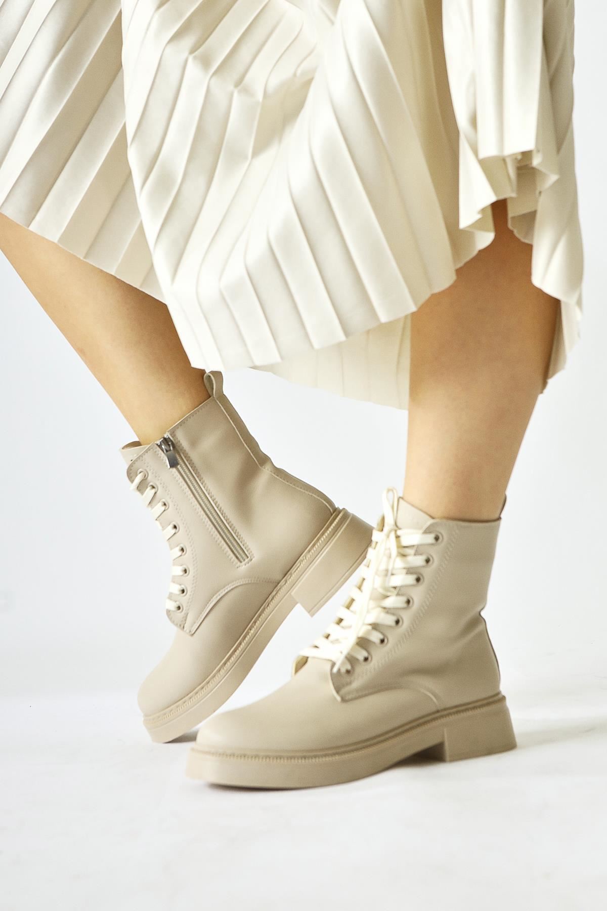 Renk: Bej Detay: Bağcıklı Fermuarlı Malzeme: Cilt Topuk Boyu: 3,5 cm Taban Materyali: Termo Taban İç Taban: Pad'li İç Taban. Kalıp: Standart Ayak Ölçülerine Göre Dar Kalıp.