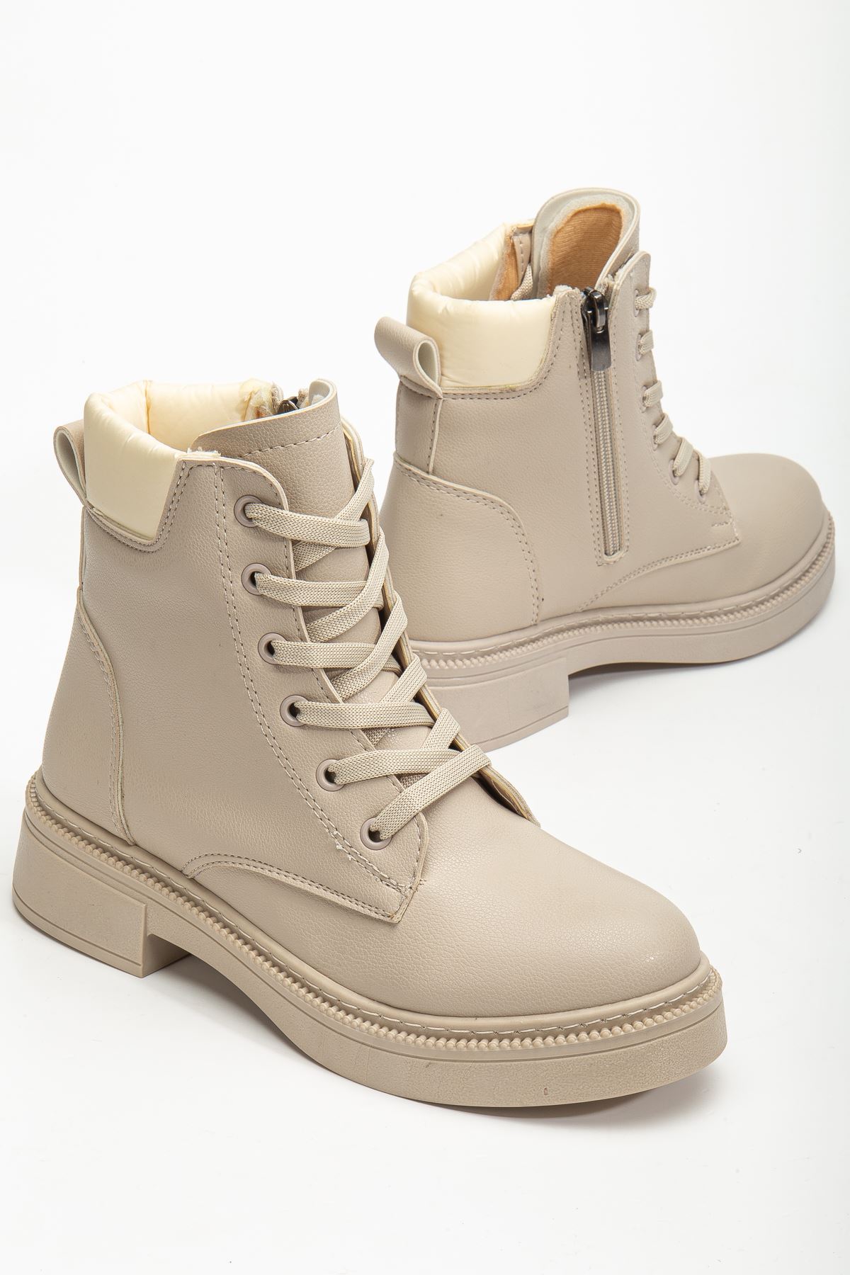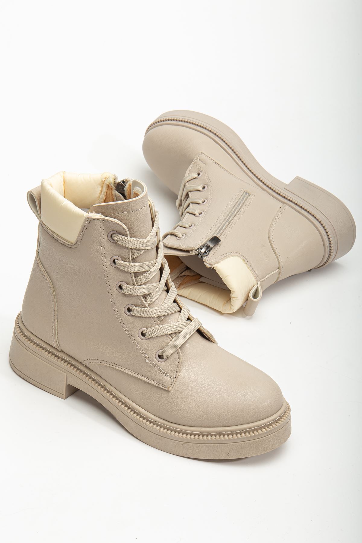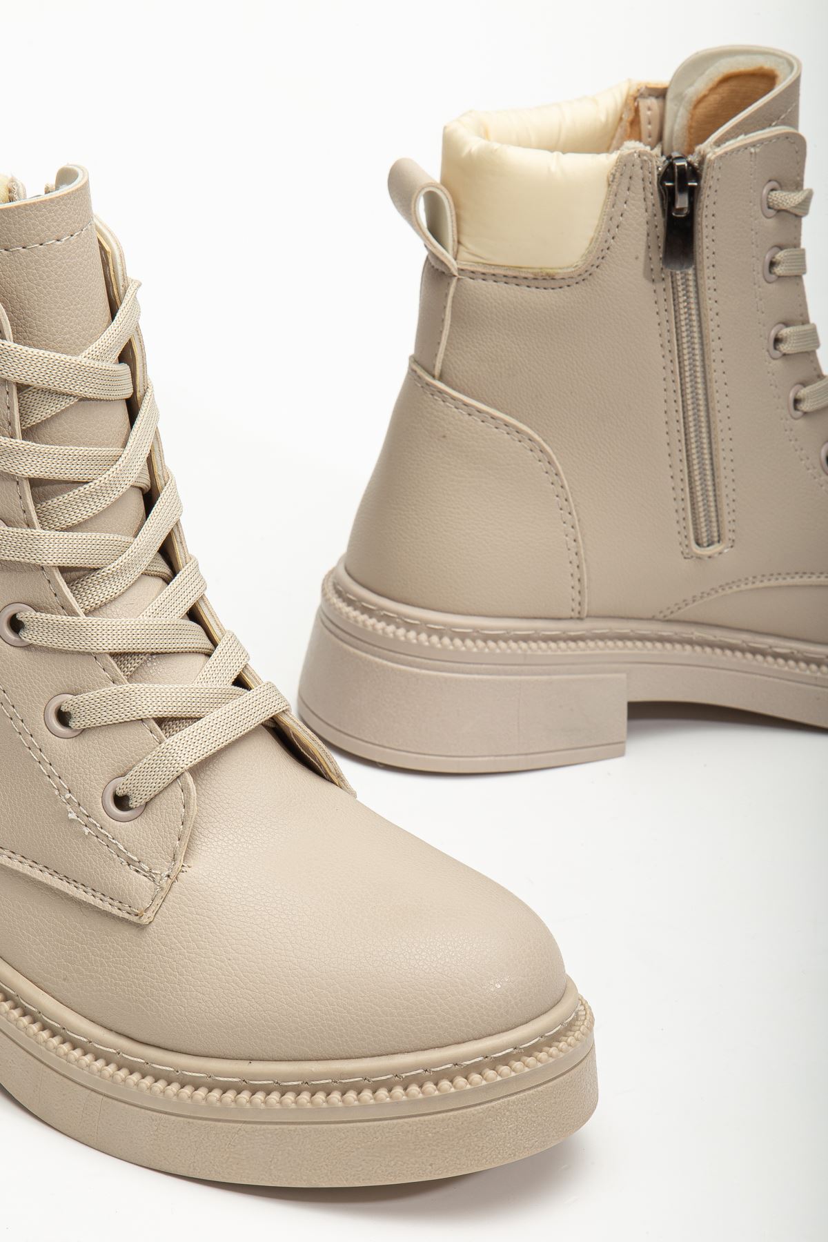 Renk: Bej Detay: Bağcıklı Malzeme: Cilt Topuk Boyu: 4,5 Cm Taban Materyali: Termo Taban İç Taban: Pad'li İç Taban. Kalıp: Standart Ayak Ölçülerine Göre Tam Kalıp.