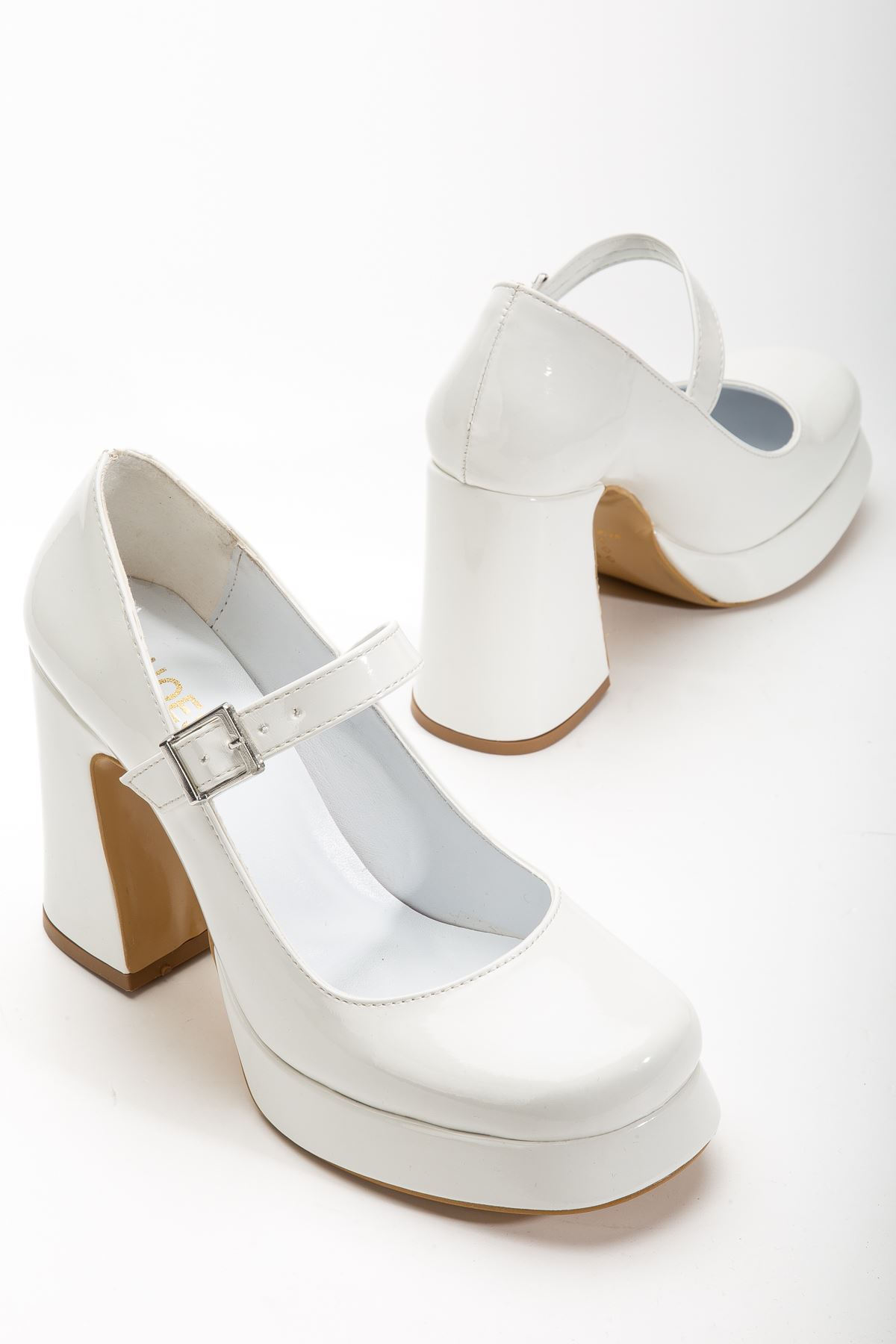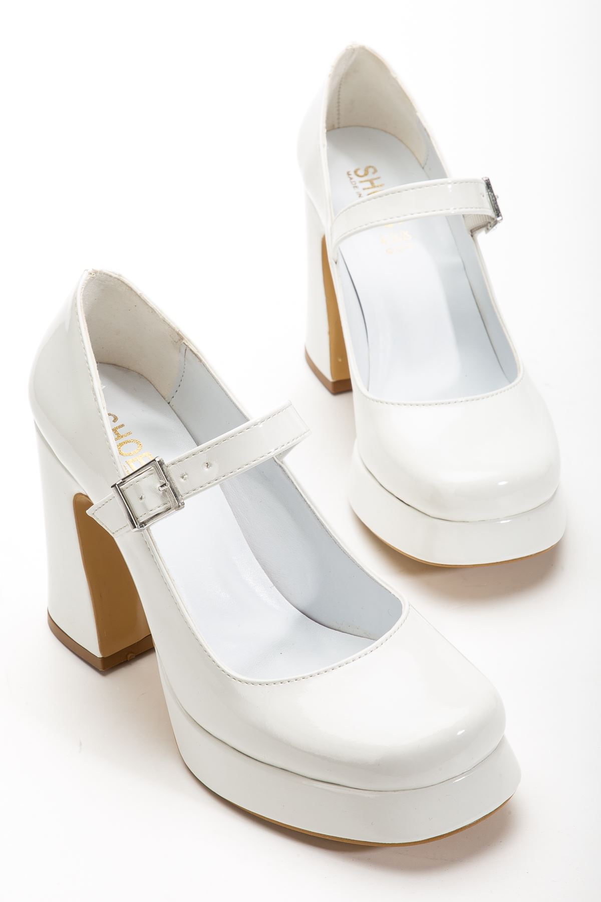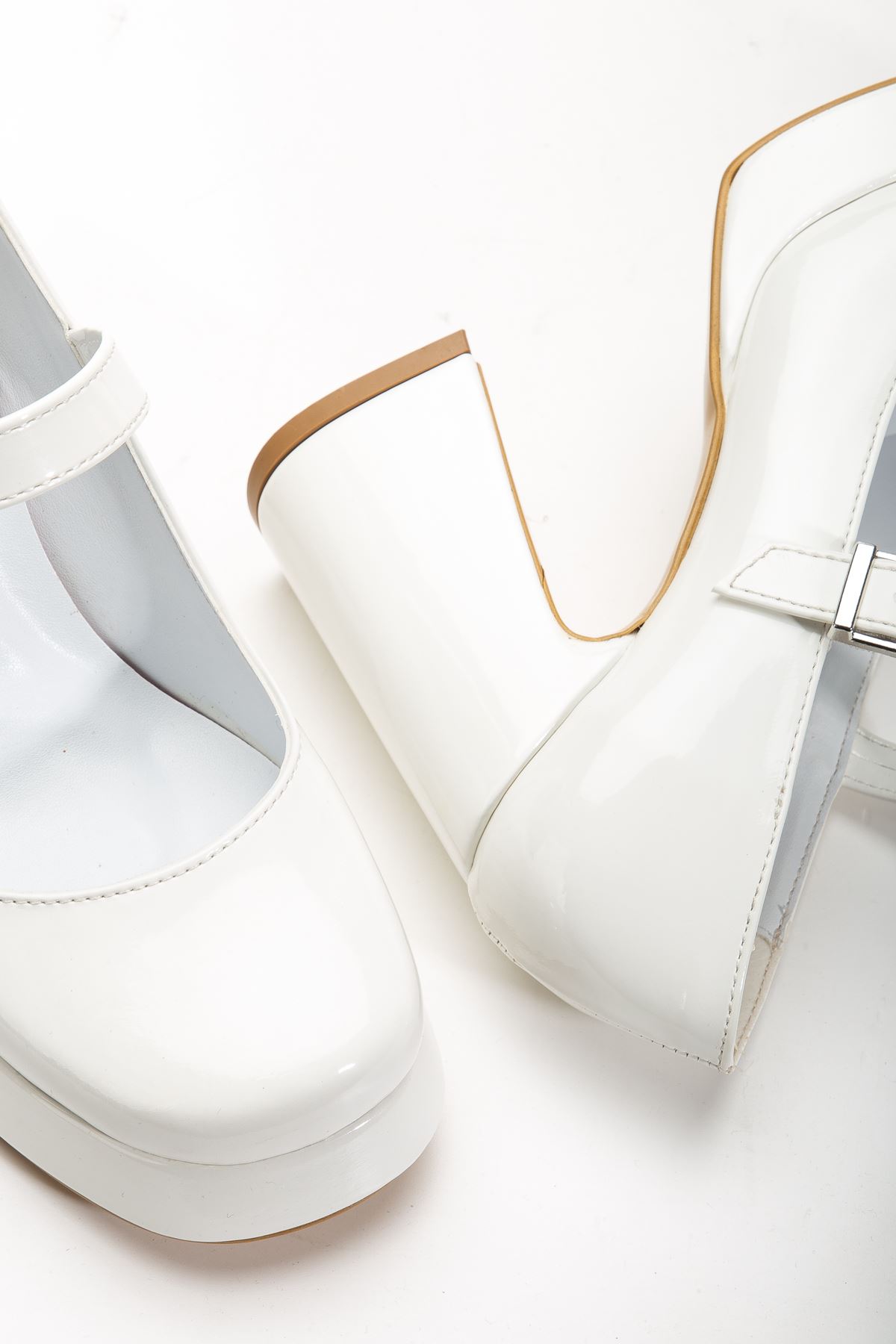 Renk: Beyaz Detay: Küt BurunMalzeme: Rugan Topuk Boyu: 10 cmPlatform: 2 cmTaban Materyali: Neolit Jurdanİç Taban: Pad'li İç Taban.Kalıp: Standart Ayak Ölçülerine Göre Tam Kalıp