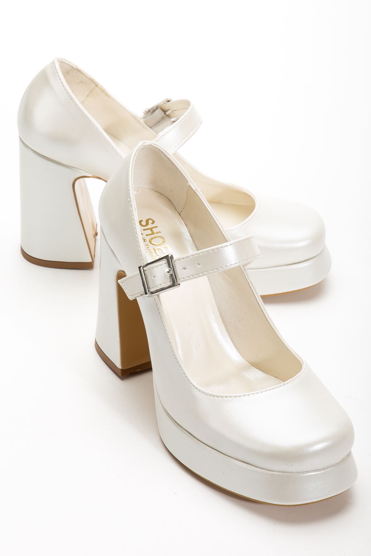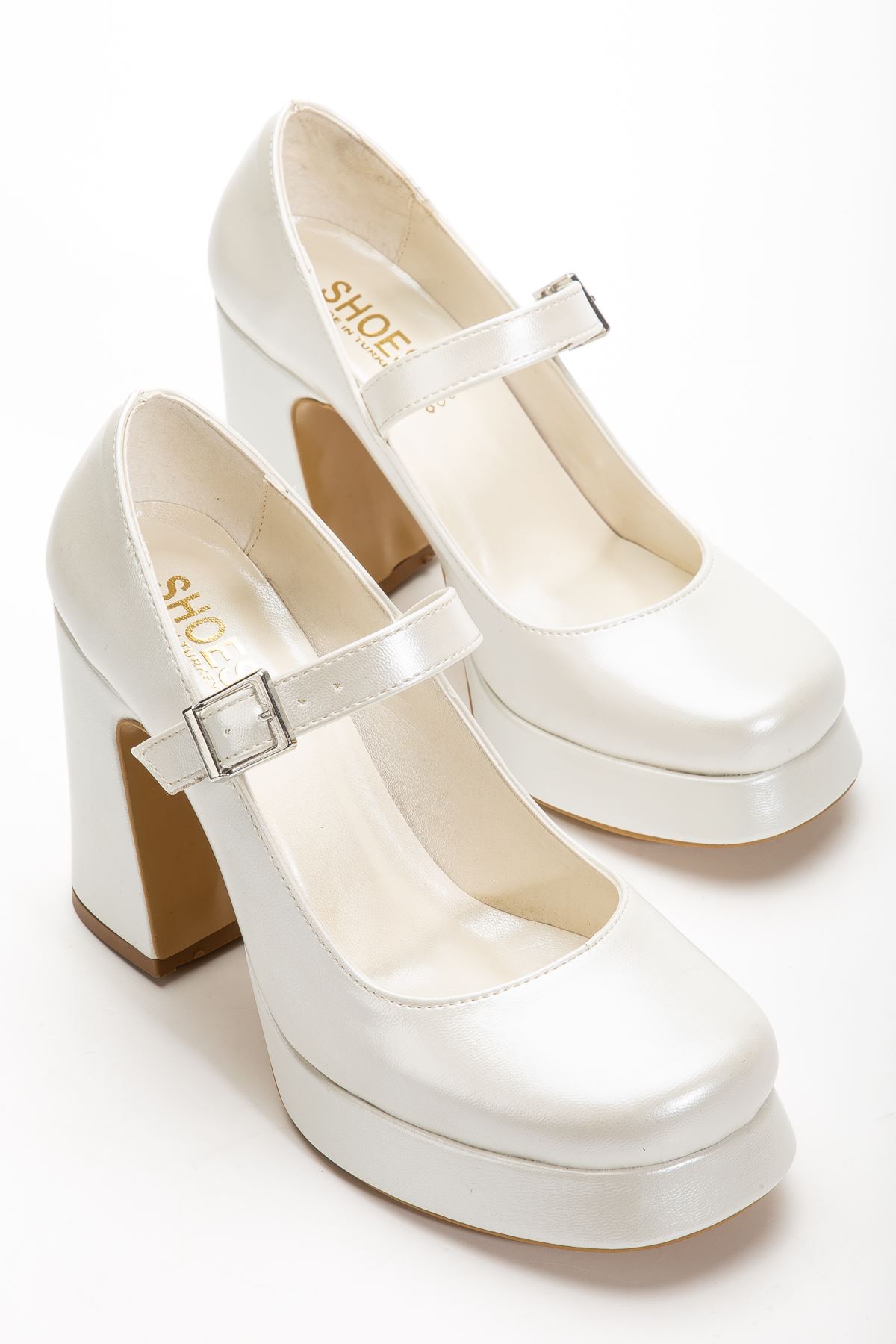 Renk: Beyaz Detay: Küt BurunMalzeme: Sedef CiltTopuk Boyu: 10 cmPlatform: 2 cmTaban Materyali: Neolit Jurdanİç Taban: Pad'li İç Taban.Kalıp: Standart Ayak Ölçülerine Göre Tam Kalıp