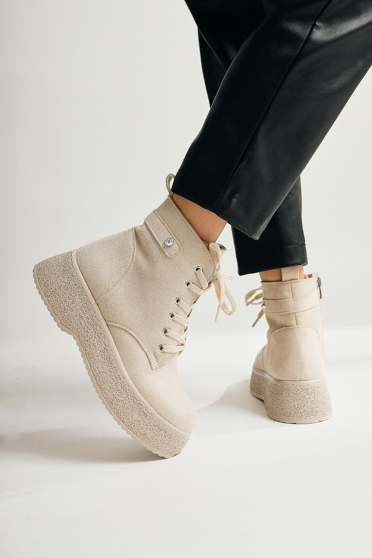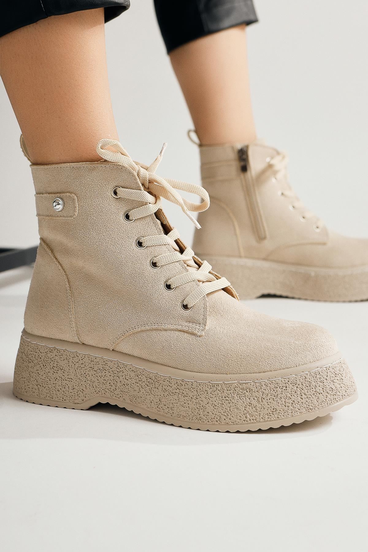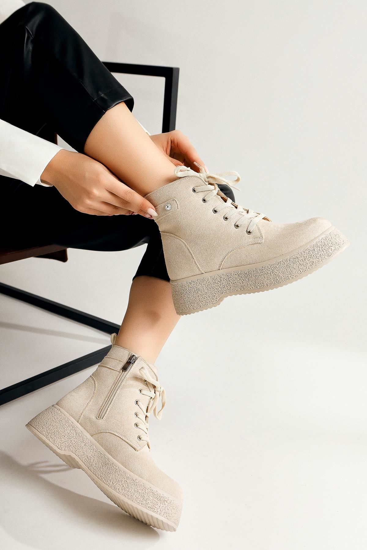 Renk: Bej Detay: Bağcıklı Yandan Fermuarlı Malzeme: Süet Topuk Boyu: 3,5 cm. Taban Materyali: Termo Taban İç Taban: Pad'li İç Taban. Kalıp: Standart Ayak Ölçülerine Göre Dar Kalıp.