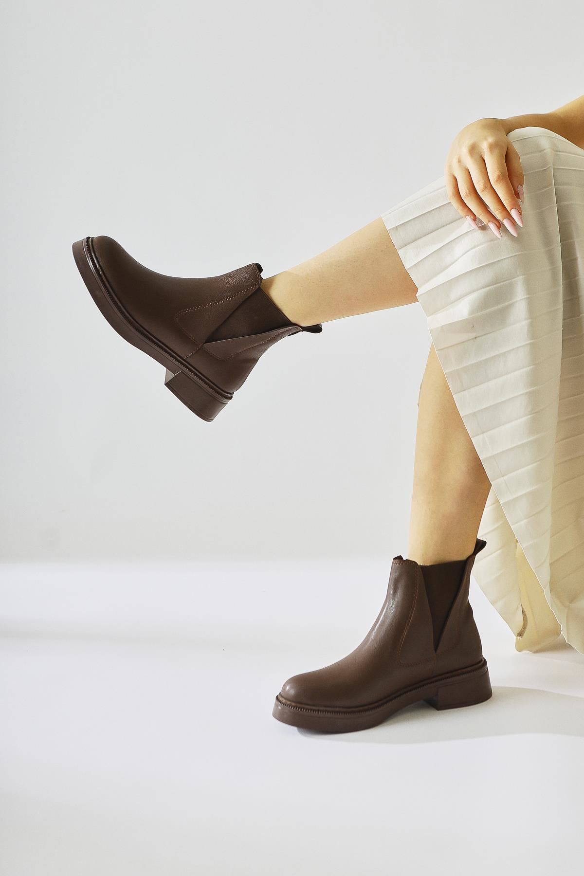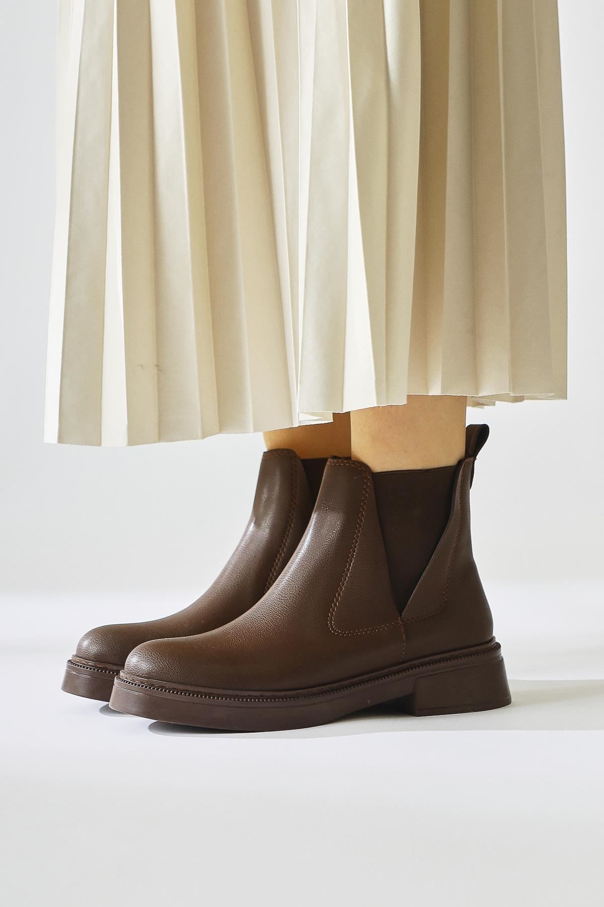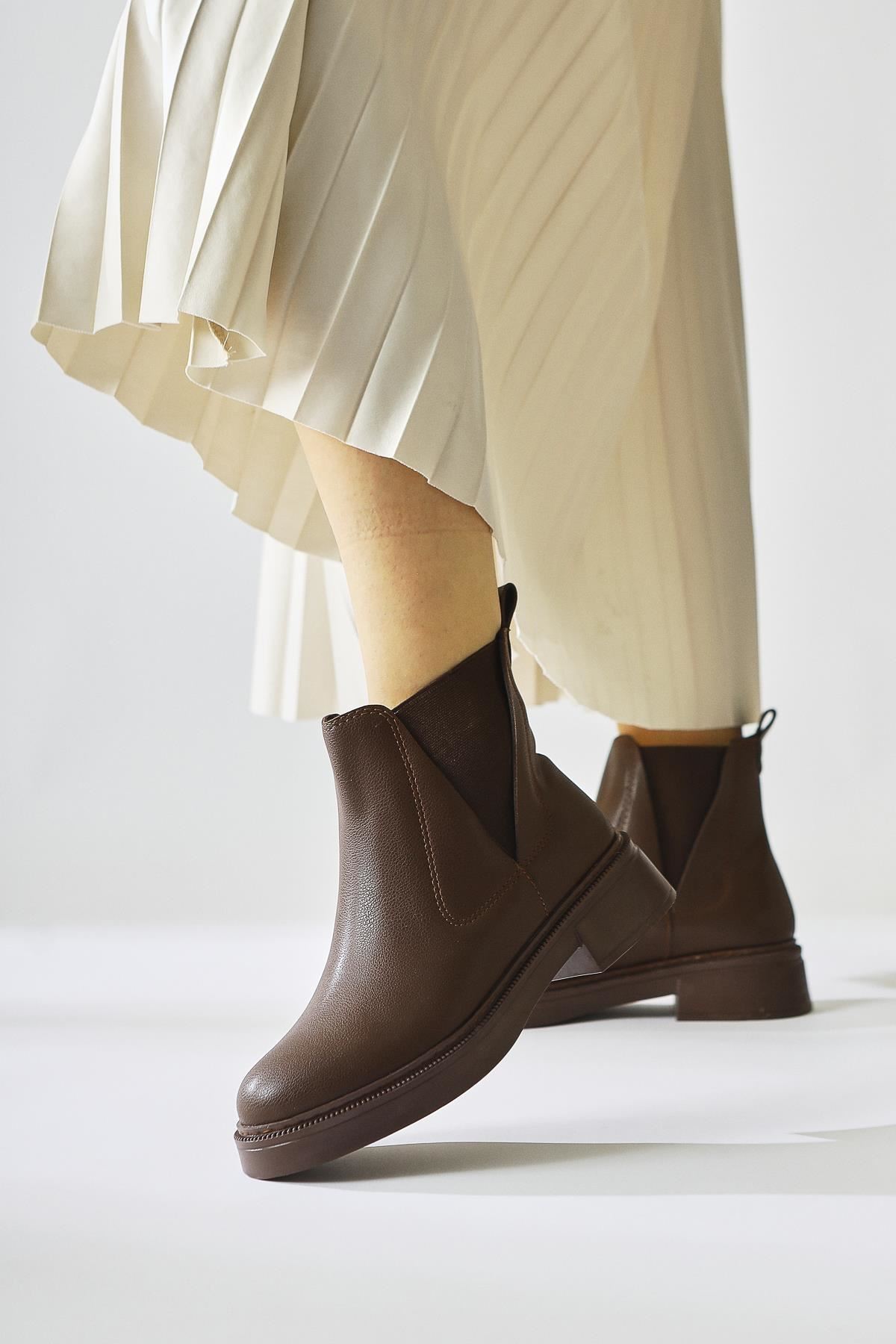 Renk: Kahverengi Detay: Yandan Lastikli Malzeme: Cilt Topuk Boyu: 3,5 cm Taban Materyali: Termo Taban İç Taban: Pad'li İç Taban. Kalıp: Standart Ayak Ölçülerine Göre Dar Kalıp.