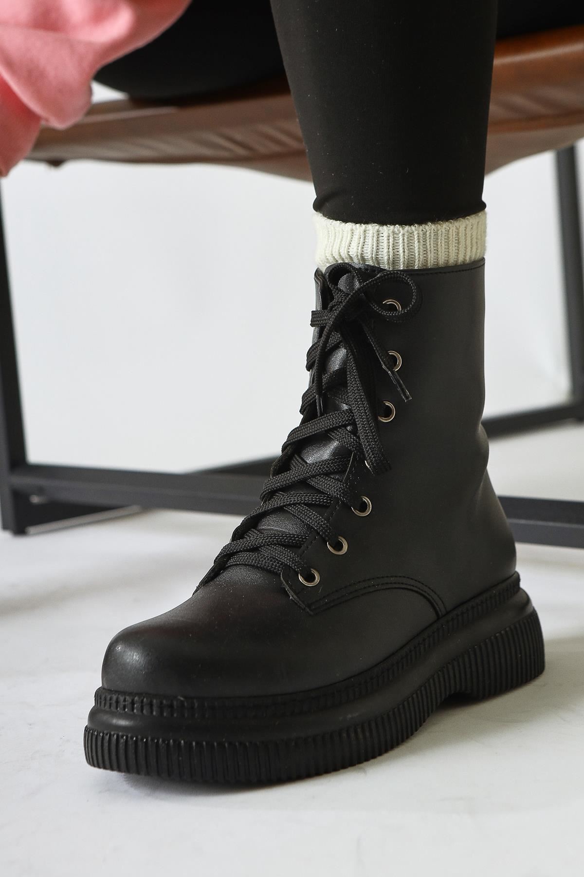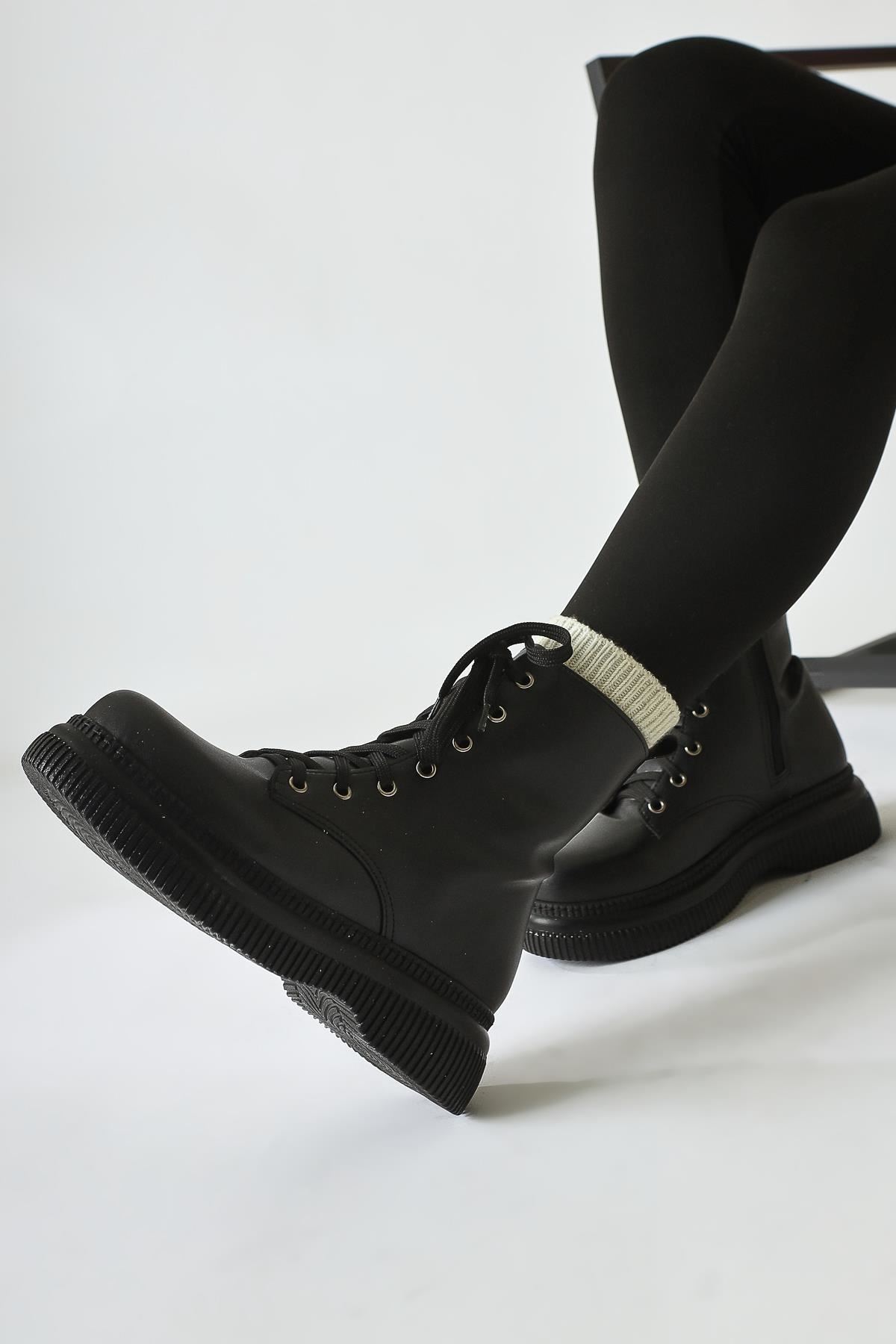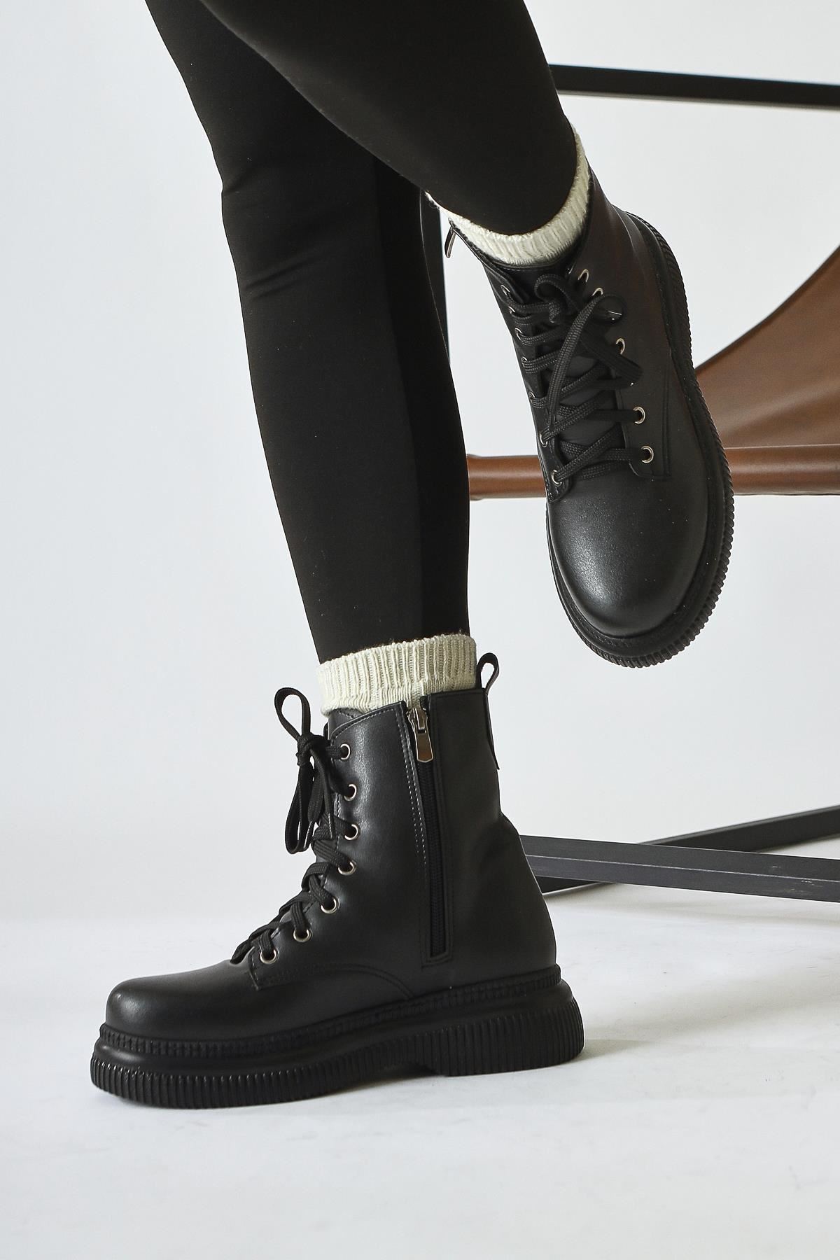 Renk: Siyah Detay: Bağcıklı Fermuarlı Malzeme: Cilt Topuk Boyu: 3,5 cm Taban Materyali: Termo Taban İç Taban: Pad'li İç Taban. Kalıp: Standart Ayak Ölçülerine Göre Dar Kalıp.