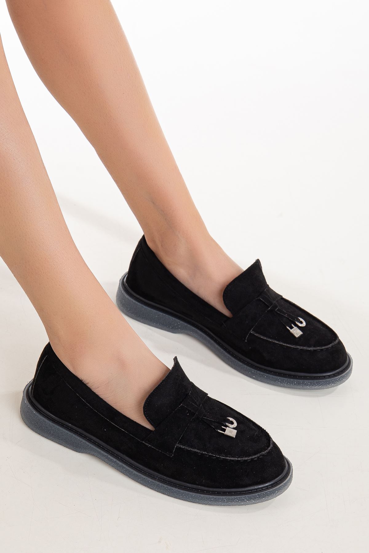 Renk: Siyah Detay: Toka İşleme Malzeme: Süet Topuk Boyu: 2 cmTaban Materyali: Termo Taban Kalıp: Standart Ayak Ölçülerine Göre Tam Kalıp.